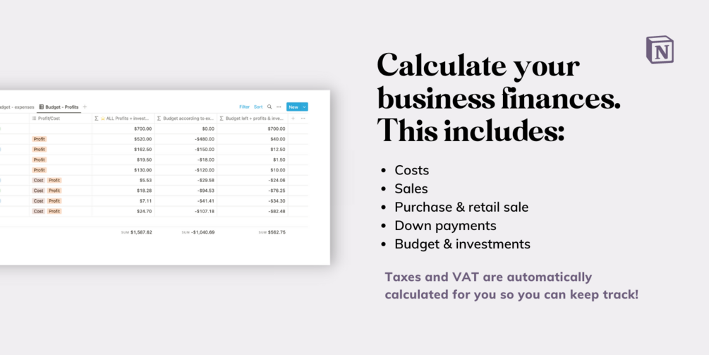 Let's face it, calculating your business finances, or calculating costs, sales and profit, isn't the most fun thing to do, and it's time-consuming. With this Notion template, you will save time doing what you think is fun - which is creating and selling your services or products!