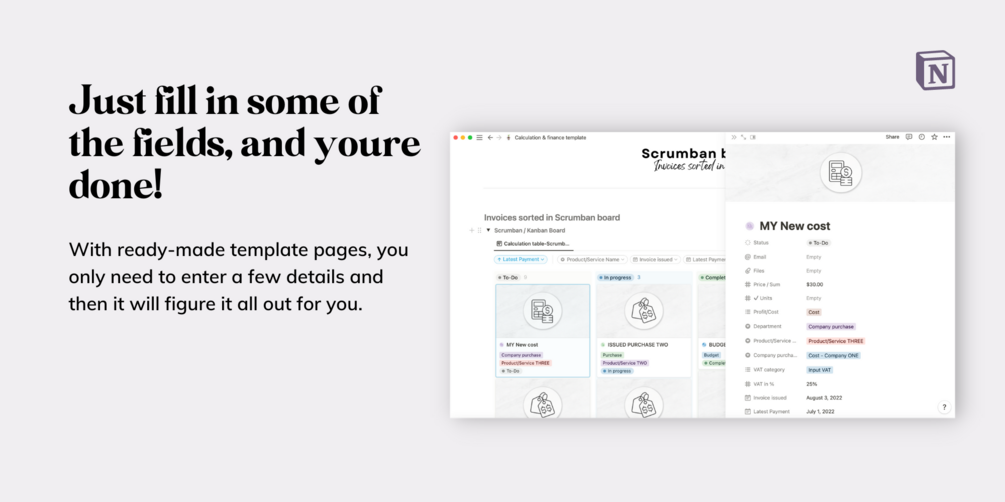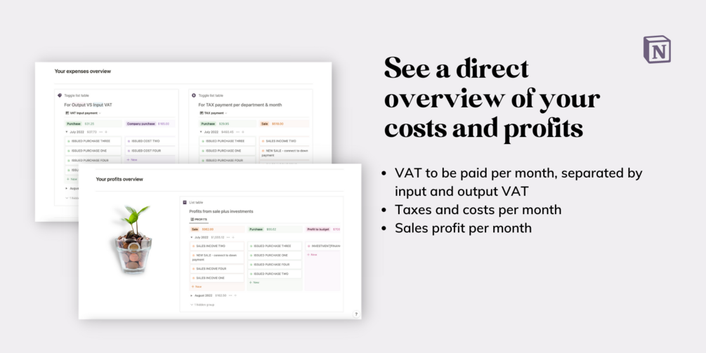 Let's face it, calculating your business finances, or calculating costs, sales and profit, isn't the most fun thing to do, and it's time-consuming. With this Notion template, you will save time doing what you think is fun - which is creating and selling your services or products!